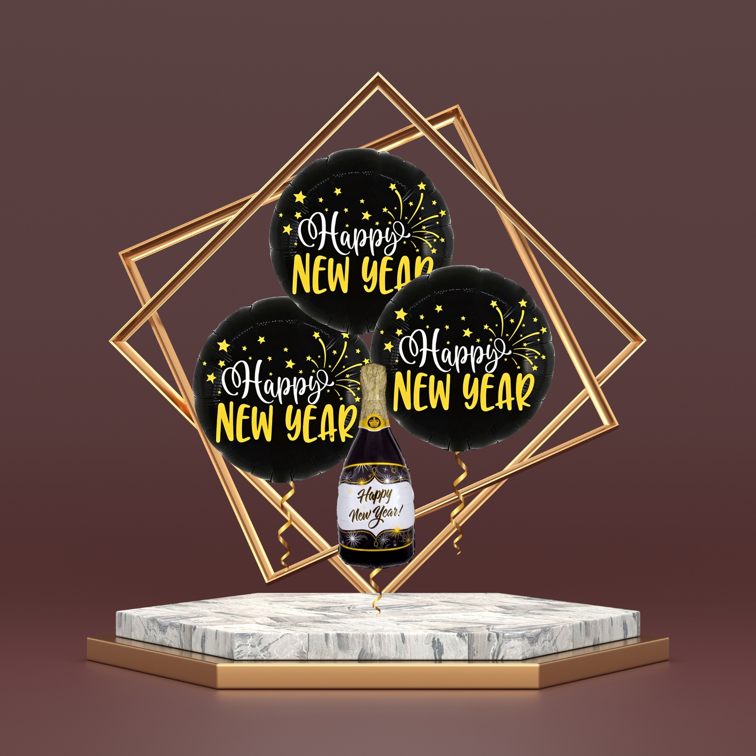 Balon zdobi wyrazisty napis „Happy NEW YEAR”, otoczony motywami gwiazdek i fajerwerków, które podkreślają radosny nastrój sylwestrowej nocy. Jego uniwersalny kształt sprawia, że pasuje do każdej koncepcji dekoracyjnej – od domowych przyjęć, przez fotobudki, aż po uroczystości w restauracjach czy klubach.