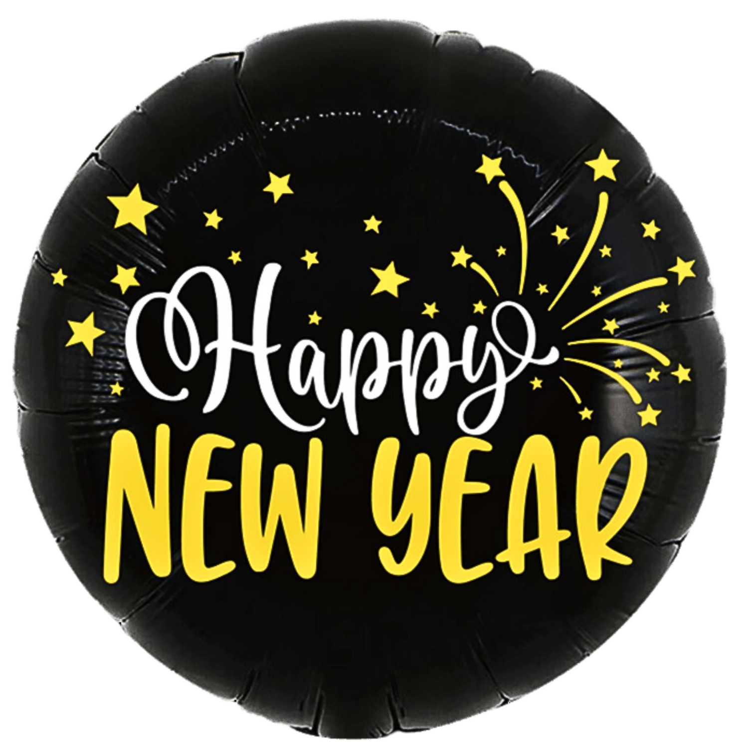 Czarny balon foliowy na Sylwestra, o okrągłym kształcie i rozmiarze 18 cali (45 cm), z wyrazistym napisem „Happy NEW YEAR” w złoto-białej kolorystyce. Idealny do dekoracji każdej imprezy noworocznej.