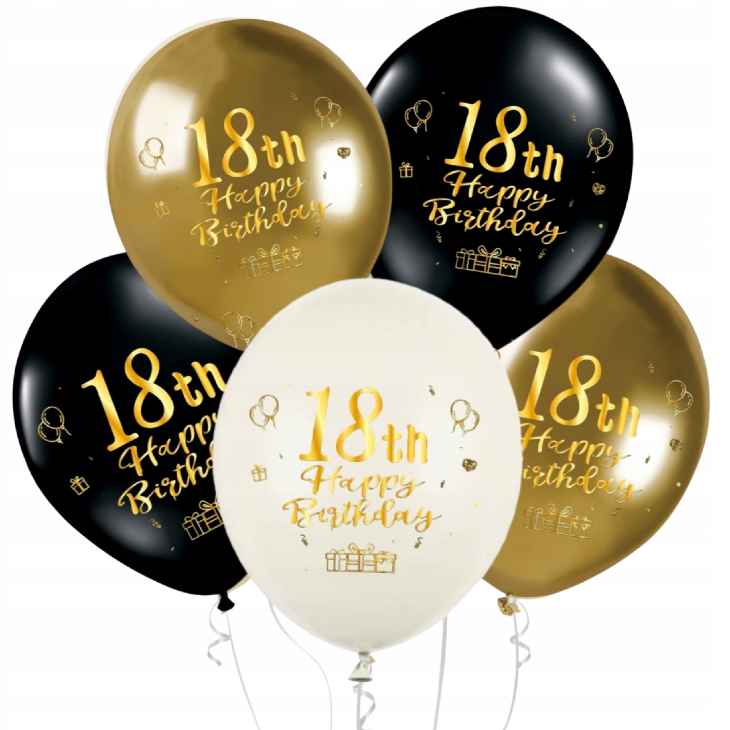 BALONY LATEKSOWE 18 URODZINY OSIEMNASTKA CZARNE ZŁOTE BIAŁE MIX 30CM 5SZTUK