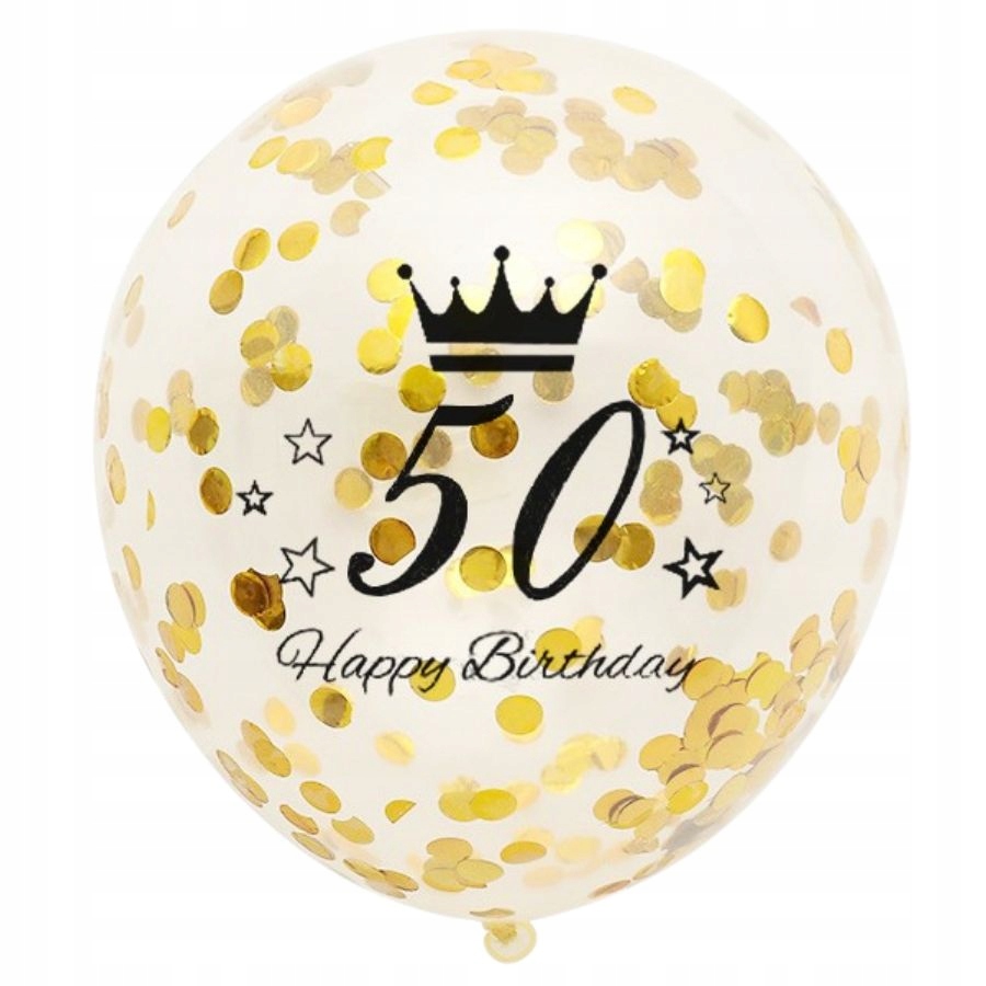 Zestaw pięciu transparentnych balonów ozdobionych dwustronnym czarnym napisem „50 Happy Birthday” to doskonały sposób na uczczenie tego wyjątkowego jubileuszu. Wnętrze każdego balonu wypełnione jest złotym, okrągłym konfetti, które nadaje im elegancji i blasku. Balony o średnicy około 30 cm są nie tylko efektowną dekoracją, ale także dodają klasy każdemu przyjęciu.