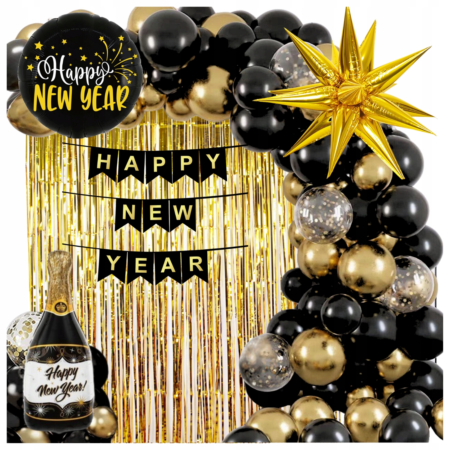Zachwyć swoich gości i powitaj Nowy Rok w spektakularny sposób dzięki naszemu zestawowi dekoracji sylwestrowych! Starannie dobrane elementy w eleganckiej złoto-czarnej kolorystyce pozwolą Ci stworzyć wyjątkowy klimat na każdej imprezie – od domowego przyjęcia po duże eventy w restauracjach czy klubach.