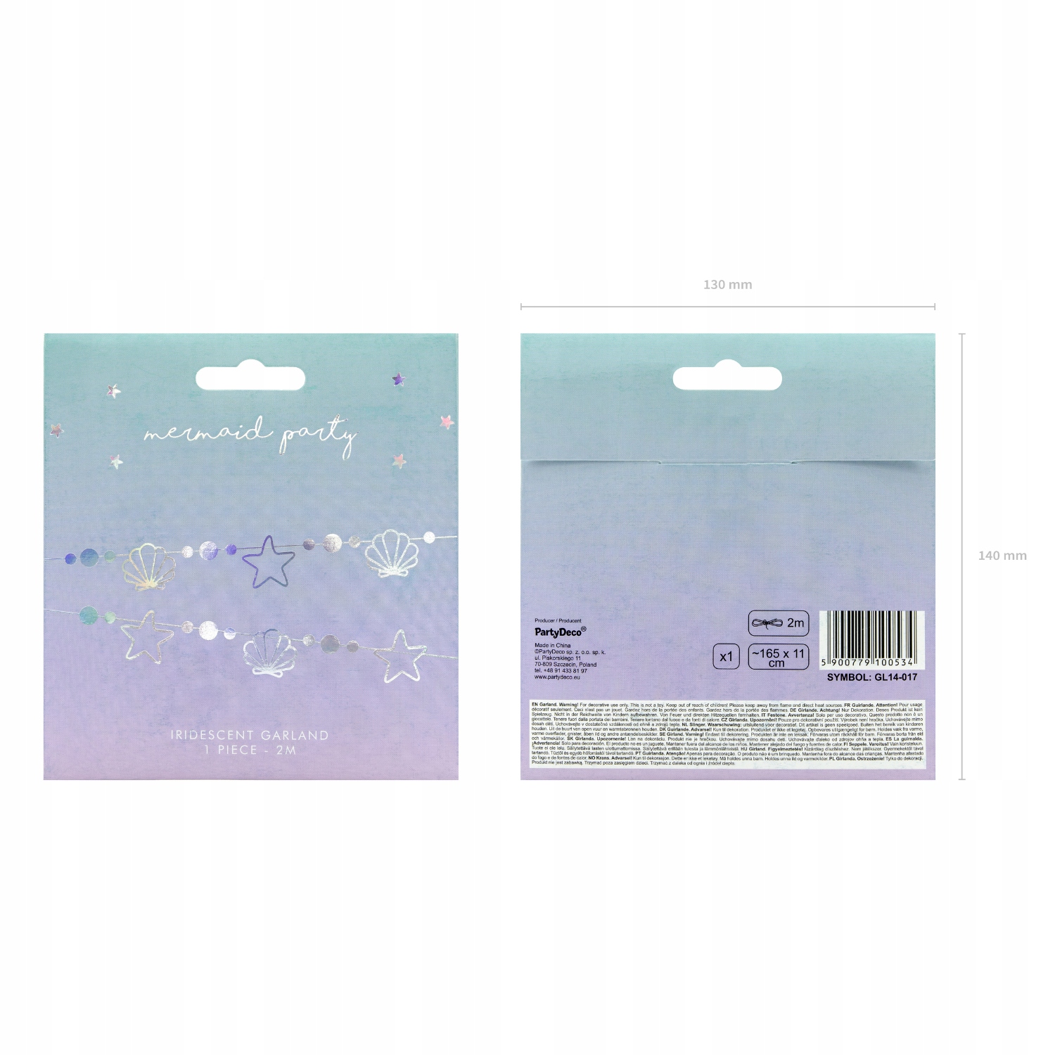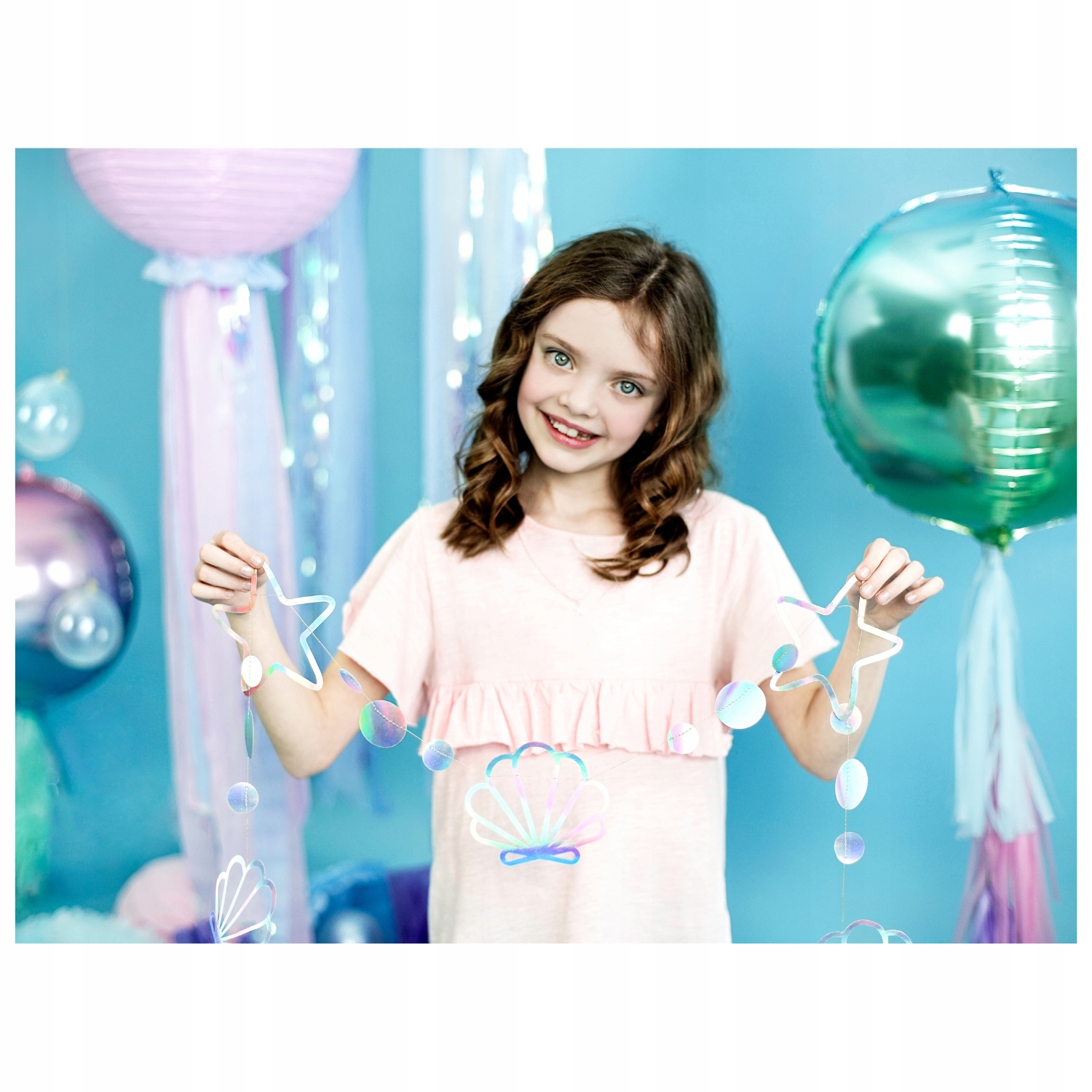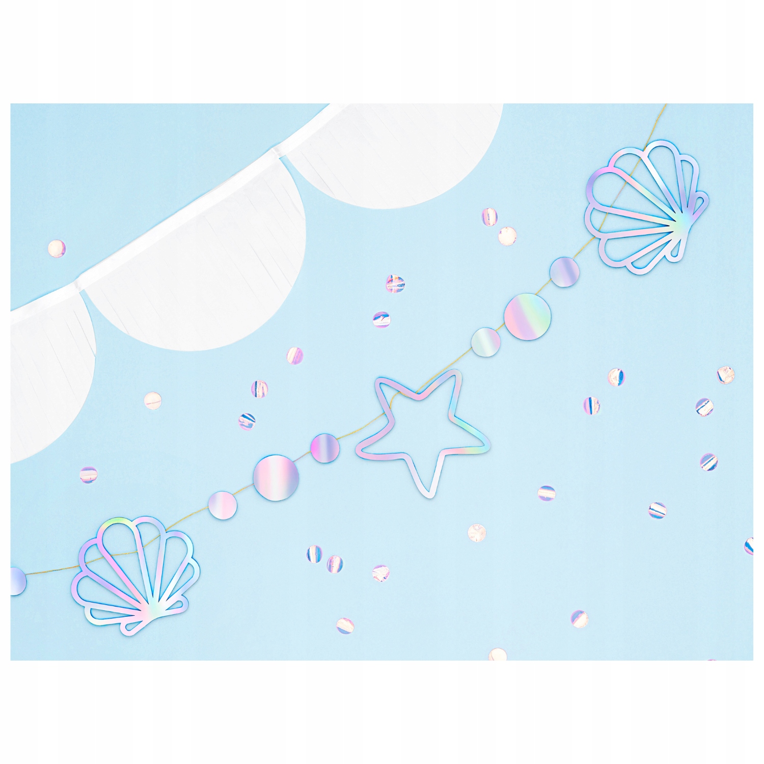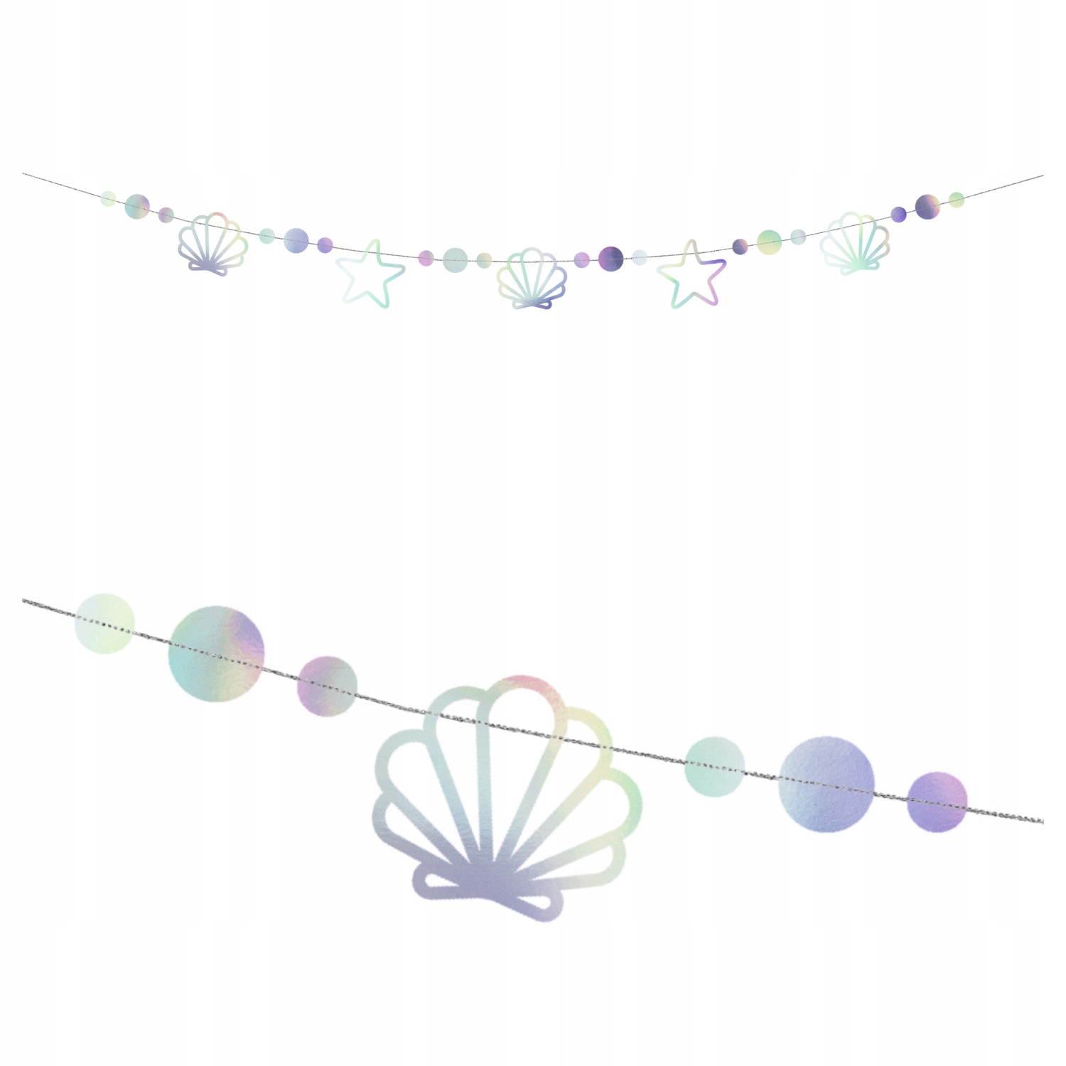Baner Syrenka – delikatna girlanda holograficzna o długości 1,65 m i wysokości 11 cm. Idealna dekoracja z motywem muszelek na urodziny i przyjęcia w stylu syrenki.