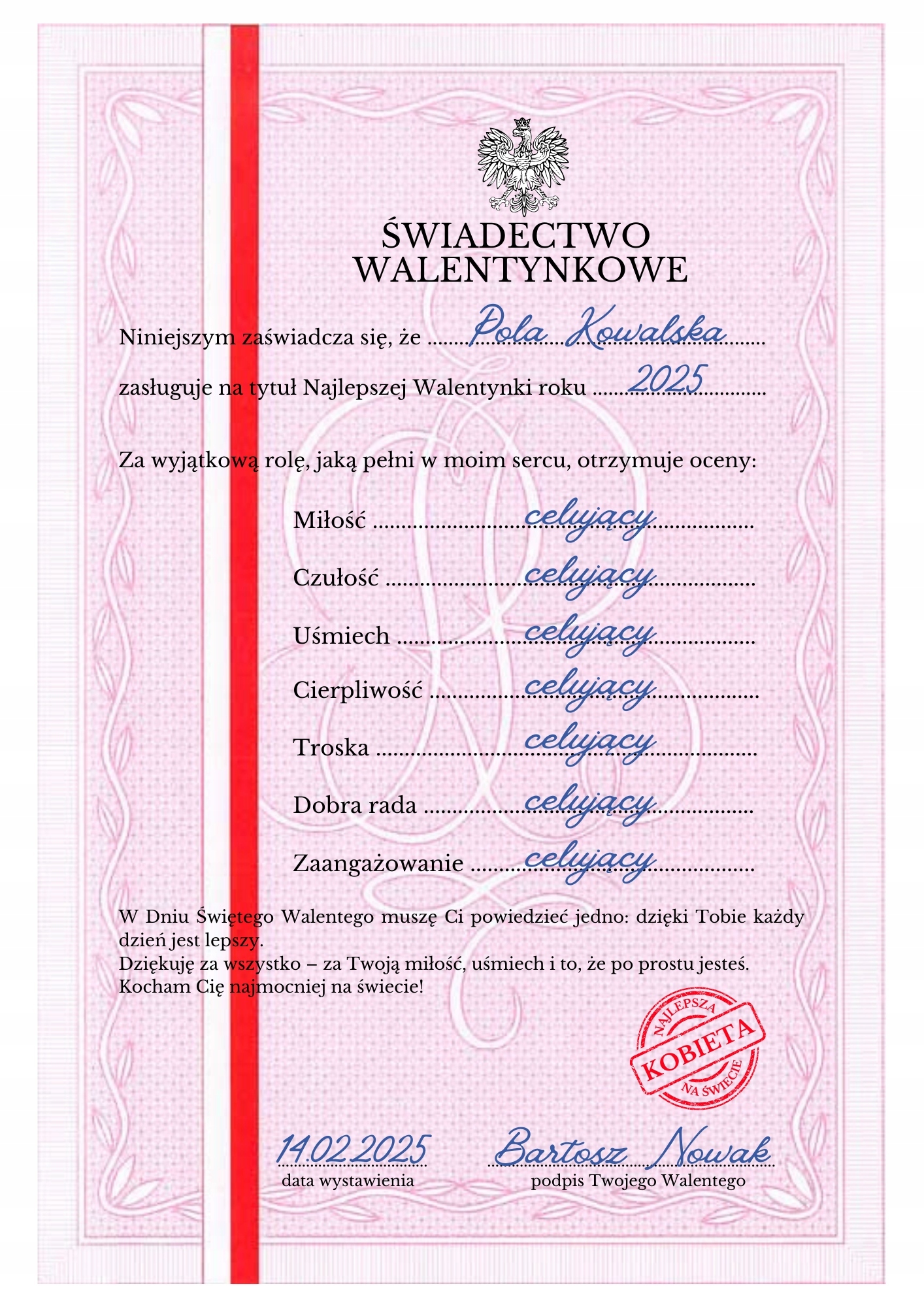 ✔ Możliwość samodzielnego uzupełnienia – wpisz imię ukochanej, oceny za jej cechy charakteru i swój podpis, nadając świadectwu osobisty wymiar