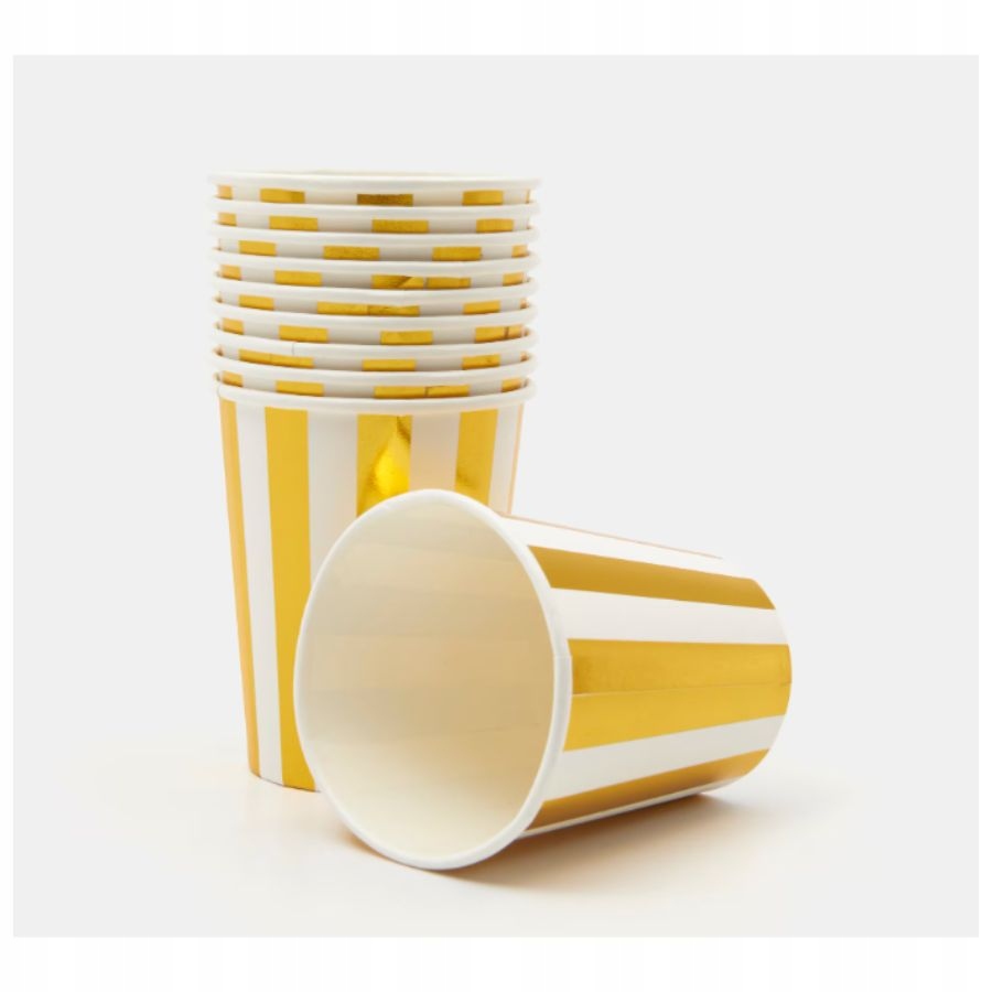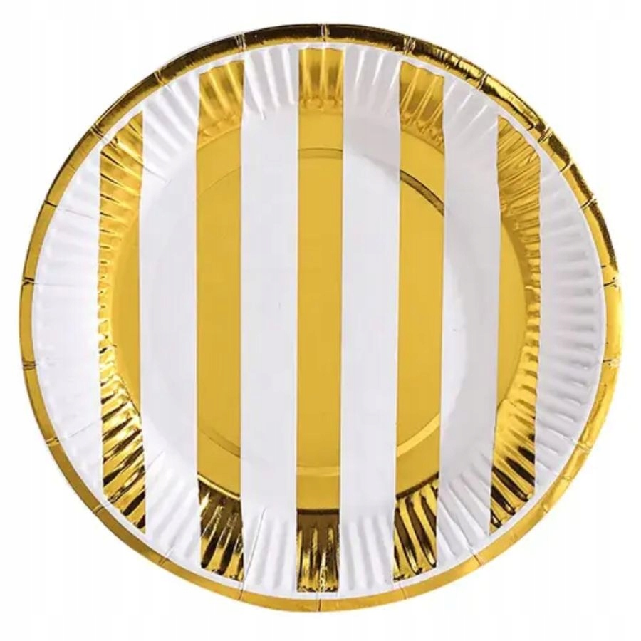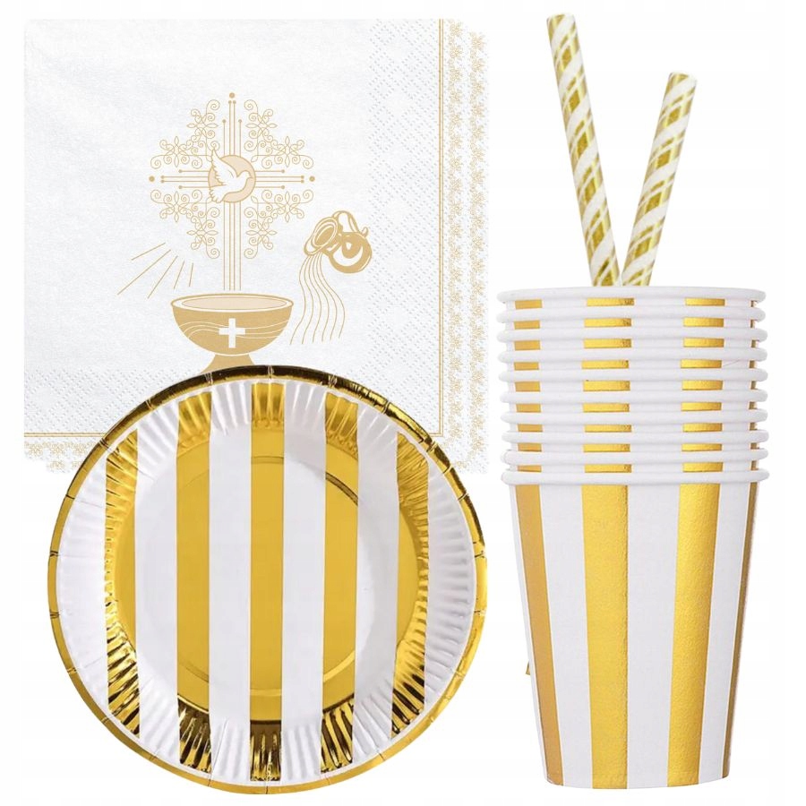 Talerzyki papierowe w białe i złote paski są trwałe i stylowe, idealne do serwowania zarówno dań, jak i słodkich przekąsek. Kubeczki papierowe utrzymane w tej samej stylistyce dodają spójności dekoracji, umożliwiając eleganckie podanie napojów. Serwetki papierowe ozdobione delikatną grafiką nawiązującą do Chrztu Świętego w kolorze złotym stanowią wyjątkowy akcent, który pięknie prezentuje się na stole, podkreślając charakter uroczystości. Całość dopełniają słomki papierowe w złote paski, które swoim subtelnym wzorem wprowadzają dodatkowy element elegancji.